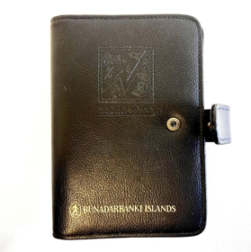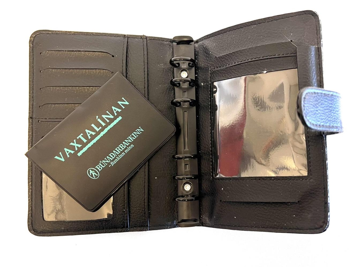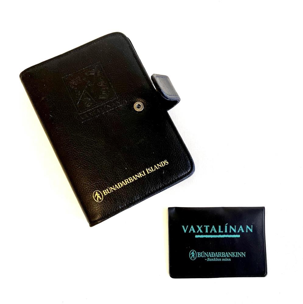 Fílófax svart merkt Búnaðarbanki Íslands með gylltu letri, en ígreipt merki og áletrun - Vaxtalínan. Fílófax er mappa/bók sem hægt var að fá í blöð - dagatöl, vikuskipulag, símaskrár ofl. Hólf fyrir kort og þ.h. Einni svart plast kortaveski með grænni áletrun - Vaxtalínan, fjármálaþjónustulína fyrir unglinga hjá Búnaðarbankanum á árunum ca. 1990-2000.