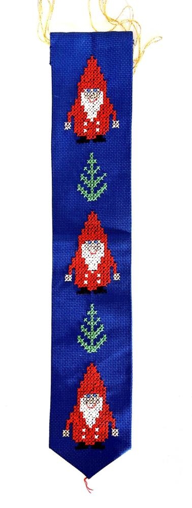 Lítill renningur, veggskraut. Krosssaumur, blár grunnur og 3 myndir af jólasveinum og 2 grenitré á milli.