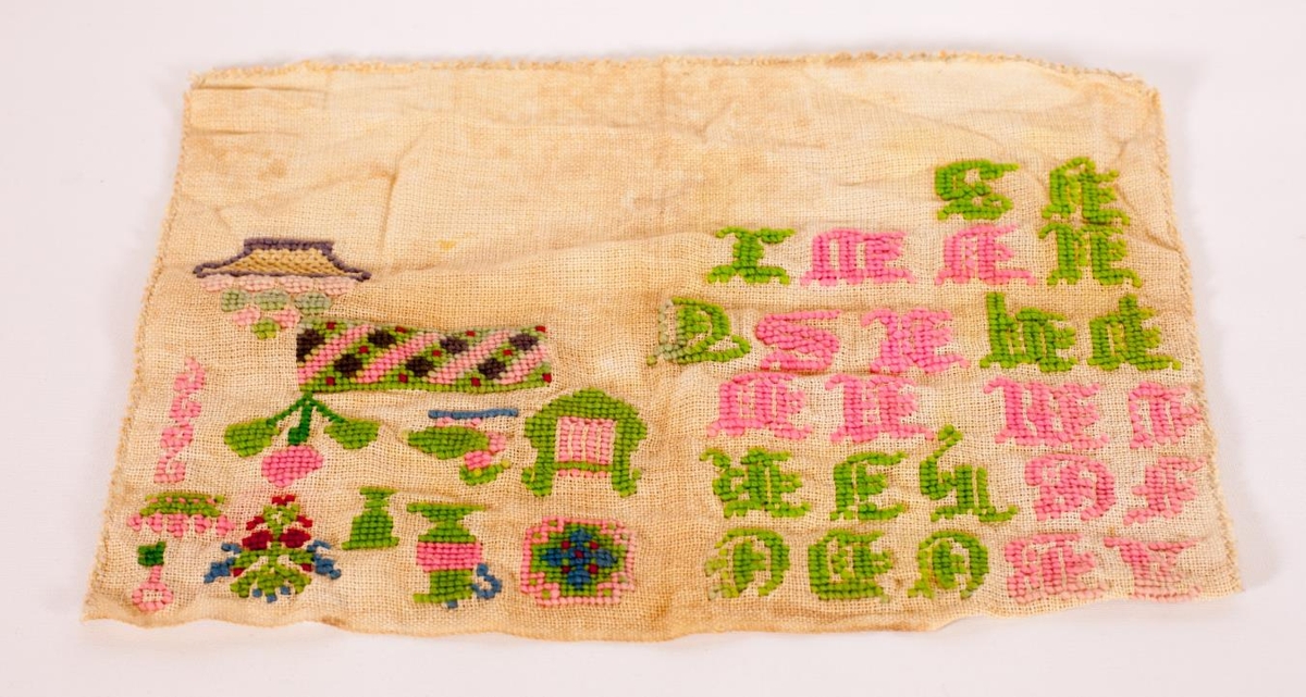 og saumaður út með bleiku og ljósgrænu garni (aðalitir). Allt stafrófið