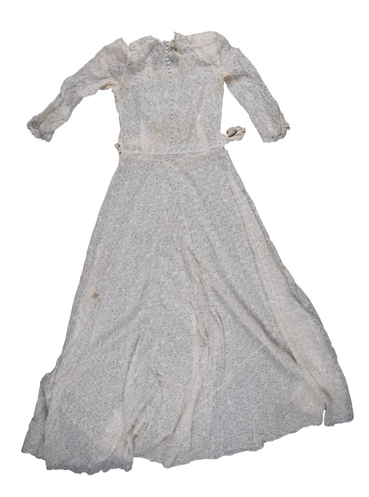 Fíngerður og gegnsær kjóll úr hvítu blúnduefni með endurteknu blómamynstri. Hnapparöð skreytir bakhlið kjólsins og nær hún frá hálsmáli niður að mitti. Hægt er að reyra kjólinn saman í mittinu með tveimur blúnduborðum sem áfastir eru í sitt hvorri hlið mittisins. Fjórar smellur eru við aðra hlið mittisins, sem blúnduborðinn felur þegar hann hefur verið bundinn saman. Hvítsaumaðir axlapúðar eru í kjólnum. Sídd kjólsins, mæld frá öxlum, er 140 cm. Mittismál er 33 cm og ermalengd, mæld frá handarkrika er 29 cm.