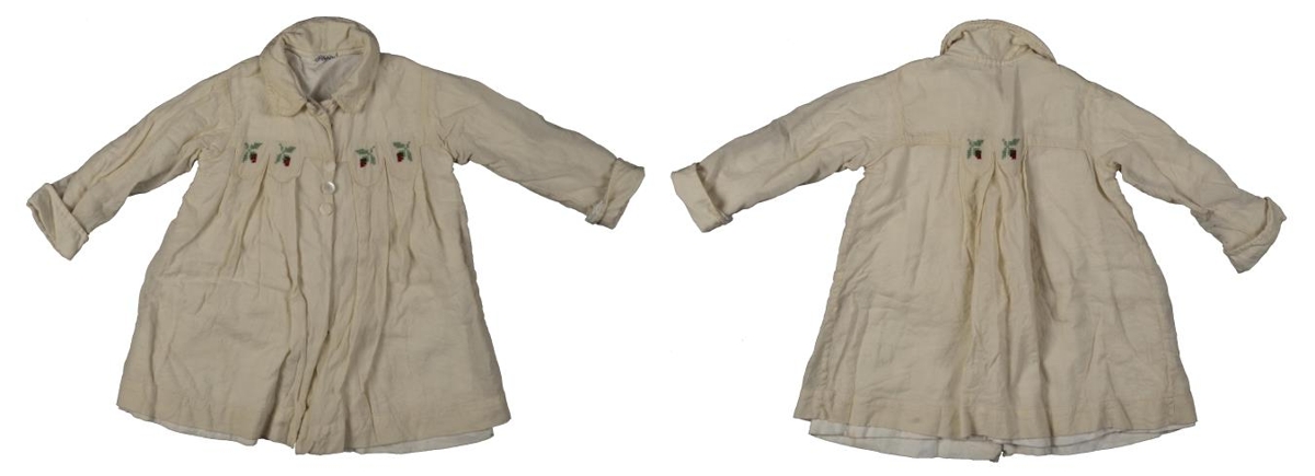 Barnakápa úr hvítu flóneli. Kragi er á kápunni og brotið er upp á ermar hennar. Í kápunni er merkmiði sem á stendur "Teddy". Yfir bringuna eru saumuð rauð og brún blóm á grænum stilki. Tvö samskonar blóm eru ofarlega fyrir miðju á baki kápunnar. Kápunni er smellt saman með fimm smellum. Að auki eru þrjár hvítar plasttölur til skrauts. Sídd kápunnar, mæld frá öxlum, er 52 cm. Ermalengd hennar, mæld frá handarkrika, er 22 cm.