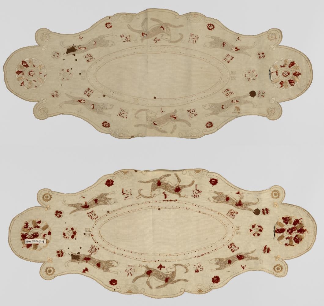 Sporöskjulaga dúkur úr kremlituðu efni. Útsaumuð blómamynstur eru í dúknum auk mynda af tveimur tegundum dýra, steingeitum og mögulega hundum. Meginlitur útsaums er drapplitaður en þá hefur rauðbrúnn þráður einnig verið notaður. Fyllt er inn í blöð blómanna með flatsaum. Dúkurinn er fremur slitinn og hefur rifnað á einum stað. Þræðir eru sums staðar farnir að trosna og því sést einungis í útlínur mynsturs sem rissaðar hafa verið í dúkinn á sumum stöðum. Þá hefur brúnn vökvi sullast á dúkinn og skilið eftir sig ummerki sem ekki hafa náðst úr.