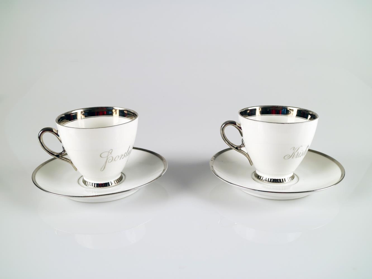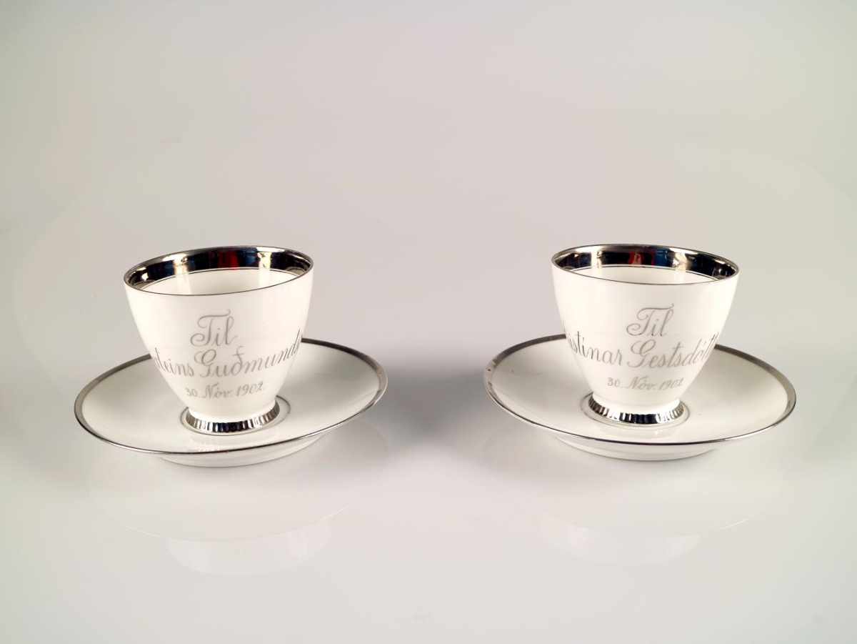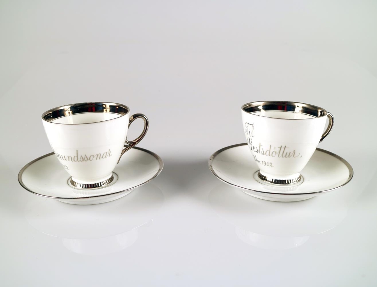 Tvö samskonar bollapör úr postulíni. Meðfram innanverðum börmum bollanna er silfurmáluð rönd, fyrir neðan önnur þynnri. Handföng bollanna eru einnig silfurmáluð. Meðfram botni bollanna er silfurmáluð rönd á gáróttu undirlagi. Á bollunum eru áletranir í silfurmálaðri skrift. Á öðrum þeirra stendur "Til Þorsteins Guðmundssonar. 30. Nóv. 1902." en á hinum bollanum er áletrunin "Til Kristínar Gestsdóttur, 30. Nóv. 1902.". Þvermál bollanna er 8,1 cm. Undirskálarnar eru í stíl við bollana. Meðfram börmum þeirra er silfurmáluð rönd. Samskonar rönd, þó þynnri, liggur hringinn í kringum þar sem bollarnir sitja. Þvermál undirskálanna er 14,1 cm. Engin merking er undir bollunum né undirskálunum sem gefur til kynna hvar bollapörin eru framleidd.
