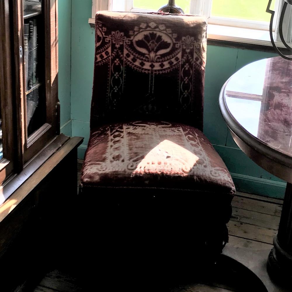 Stofuhúsgögn, sóffi og tveir stólar, klædd rauðu "plussi" sem er talsvert slitið. Þau eru að ætla má innflutt frá Danmörku og keypt 1914 er þau Gísli og Guðrún giftust.