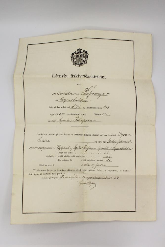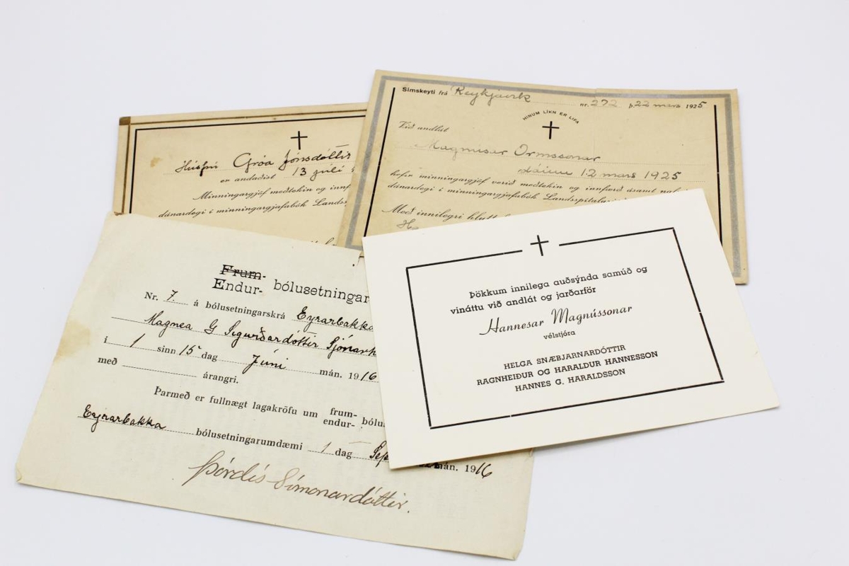 Bólusetningarvottorð Magneu Gróu frá árinu 1916, sveinsbréf Sigurðar Ísleifssonar trésmiðs 1900. Minningabréf skrautskrifað á pappír íslensk fiskveiðiskírteini handa Höfrung frá Eyrarbakka 1914.Mynstur eftir Odd Oddsson. Afrit af ljóði.