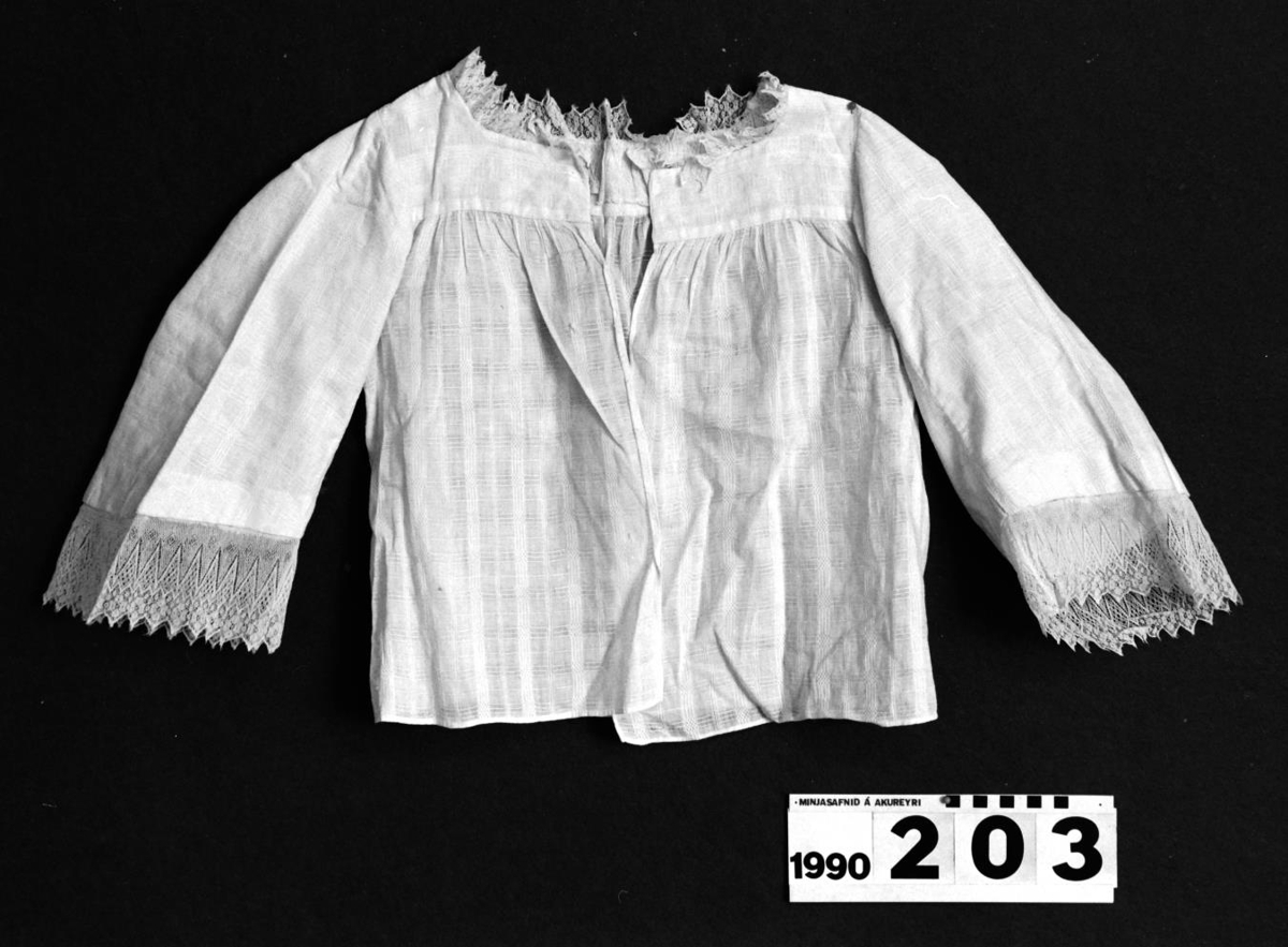 Í hálsmáli og framan á ermum er hvít bómullarblúnda. Sídd 47 sm. (með blúndu).