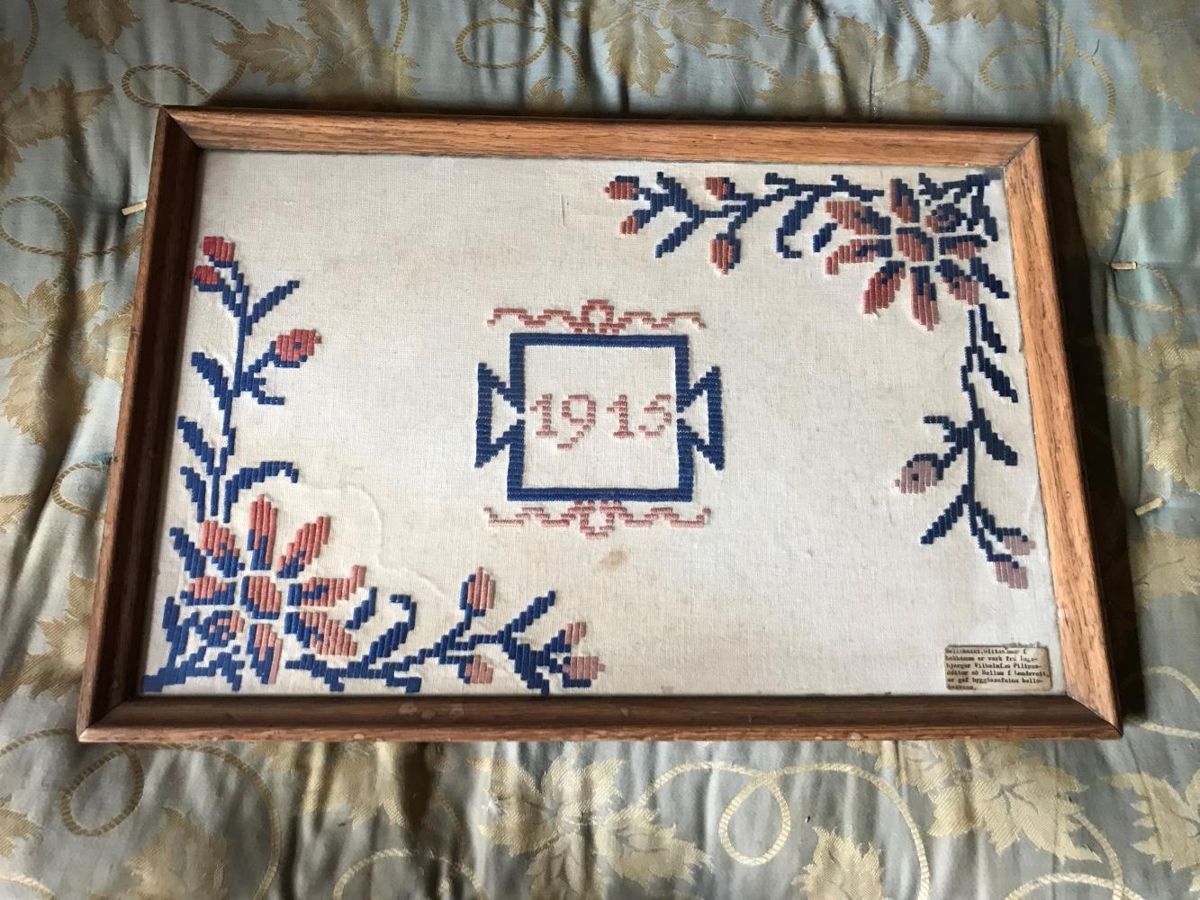 Bollabakki, hördúkur ísaumaður með gobelínsaum, ártal 1915, undir gleri og í eikarumgerð, stærð 60,5 x 40,7 cm. Saumurinn verk frú V. Ingibjargar Filippusdóttur á Hellum í Landssveit, gefanda.