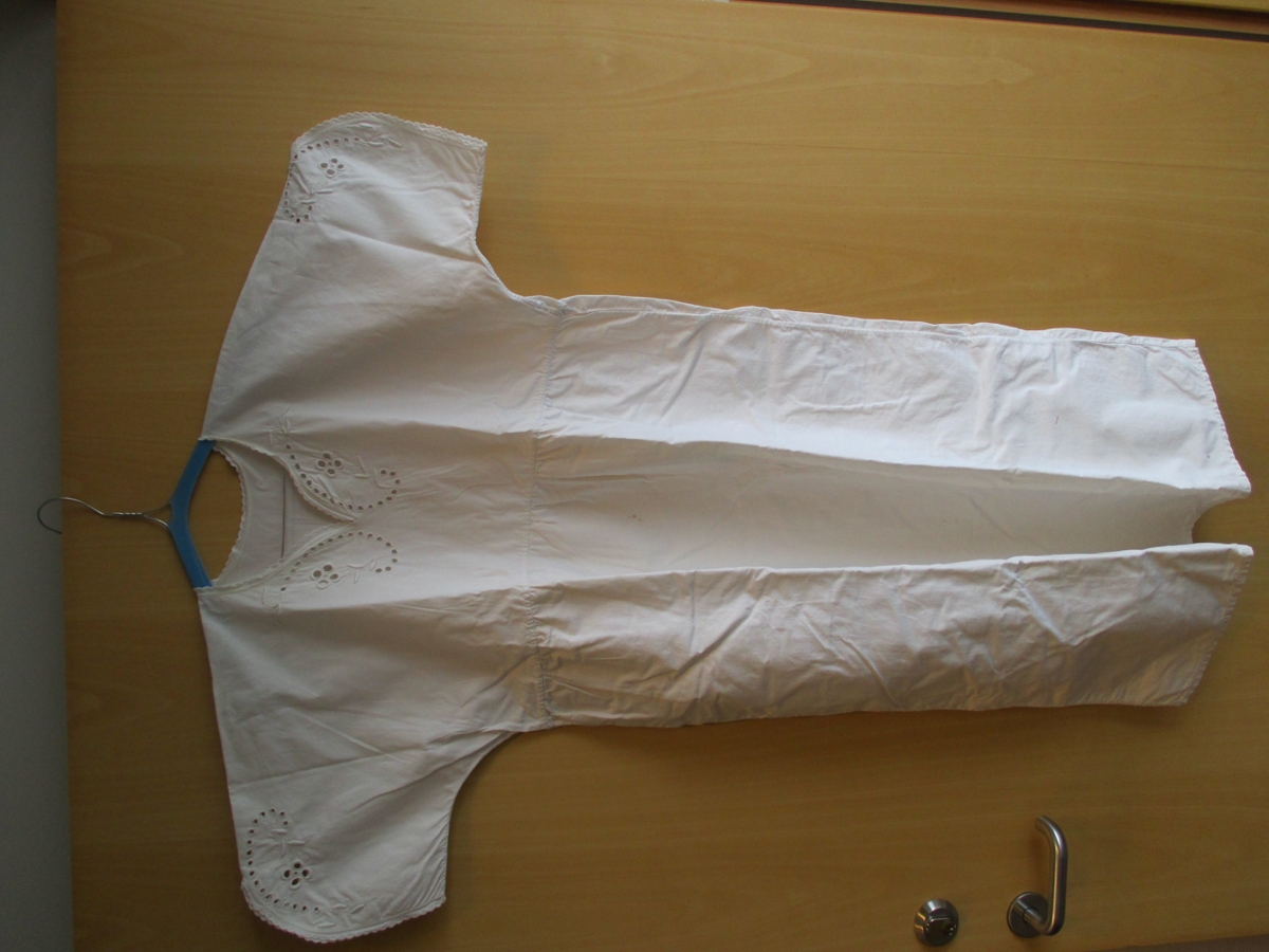 Útsaumaður léreftsnáttkjól með fylltum flatsaum og gatasaumi. Saumaður af Guðlaugu Jónsdóttur frá Syðra-Velli í Gaulverjabæjarhreppi, seinna húsfreyju á Galtastöðum, saumað 1915-1920.