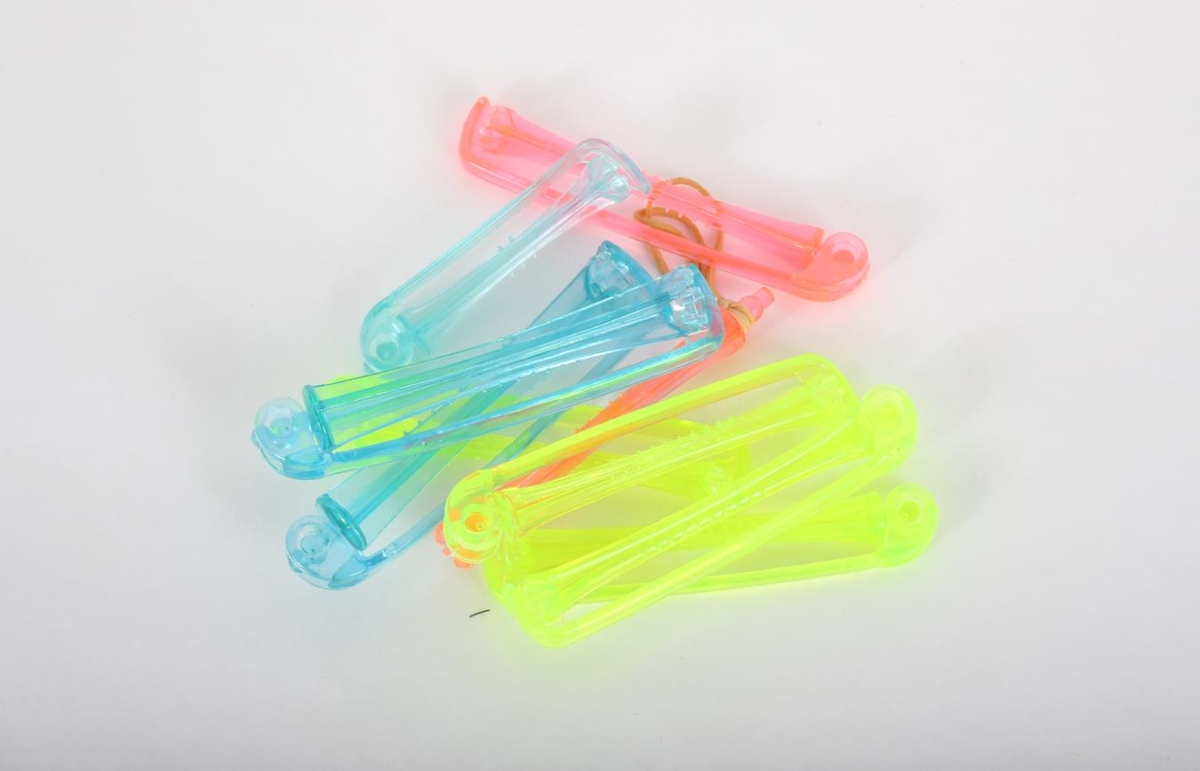 72 stk af permanent rúllum úr plasti með áfastri teygju/klemmu. Nokkrir mismunandi litir og tegundir.