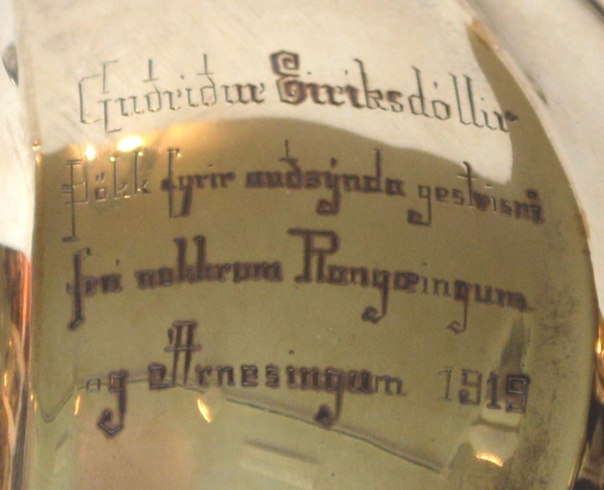 Silfurkaffikanna. Áletrun: "Guðríður Eiríksdóttir. Þökk fyrir auðsýnda gertrisni frá nokkrum Rangæingum og Árnesingum 1919". Kannan er 25,5 cm á hæð og breiðasti hluti hennar frá haldi til stúts er 23,5 cm. Þvermálið efst er 7,7 cm þegar lokið er opið en neðst er hún 12,5 cm í þvermál og hún stendur á fjórum fótum sem eru í líki laufblaða. Kannan er aðeins orðin blettótt við stútinn, á lokinu og á handfanginu. Undir könnunni eru þrír gæðastimplar. Stimpill með þremur turnum er tákn fyrir danskt silfur ásamt tölunni 19 sem er stytting fyrir 1919, árið sem gripurinn var framleiddur. Turnarnir þrír tryggja líka að silfurmagnið er að lágmarki 0.826% sem er lágmarksviðmið silfursmíðar samkvæmt dönskum lögum frá 1893. Skjöldur með bókstöfunum D og A milli hamars sem er merki Dansk Arbejde sem var stofnað árið 1908 til að stuðla að aukinni neyslu á dönskum vörum. CHF er gæðastimpill málmprófarans og silfursmiðsins Christian F. Heise sem vann við silfursmíði frá árunum 1904 til 1932. Inga systir þeirra bræðra (gefenda) varðveitti könnuna vestur í Los Angeles og ósk hennar var að hún yrði varðveitt í Skógasafni.