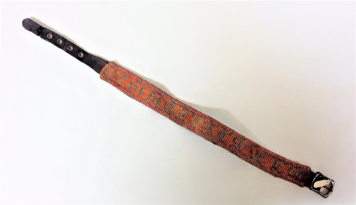 Sokkaband með hringju og sprota L.46 cm. Í það er saumað með krosssaumi Þ.J. Ægissíðu 1920.