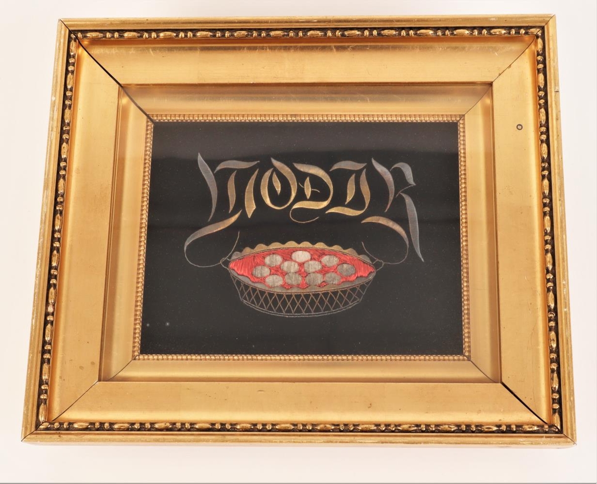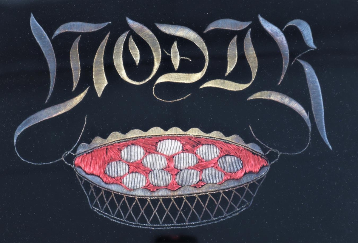 Baldíruð mynd. Myndefni: karfa með 11 eggjum, orðið "móðir" fyrir ofan. Efni: gullþráður, silkiþráður, flauel (grunnur). Litur: gylltur, rauður, hvítur, svartur. Ramminn gylltur, (tvöfaldur), útflúraður.