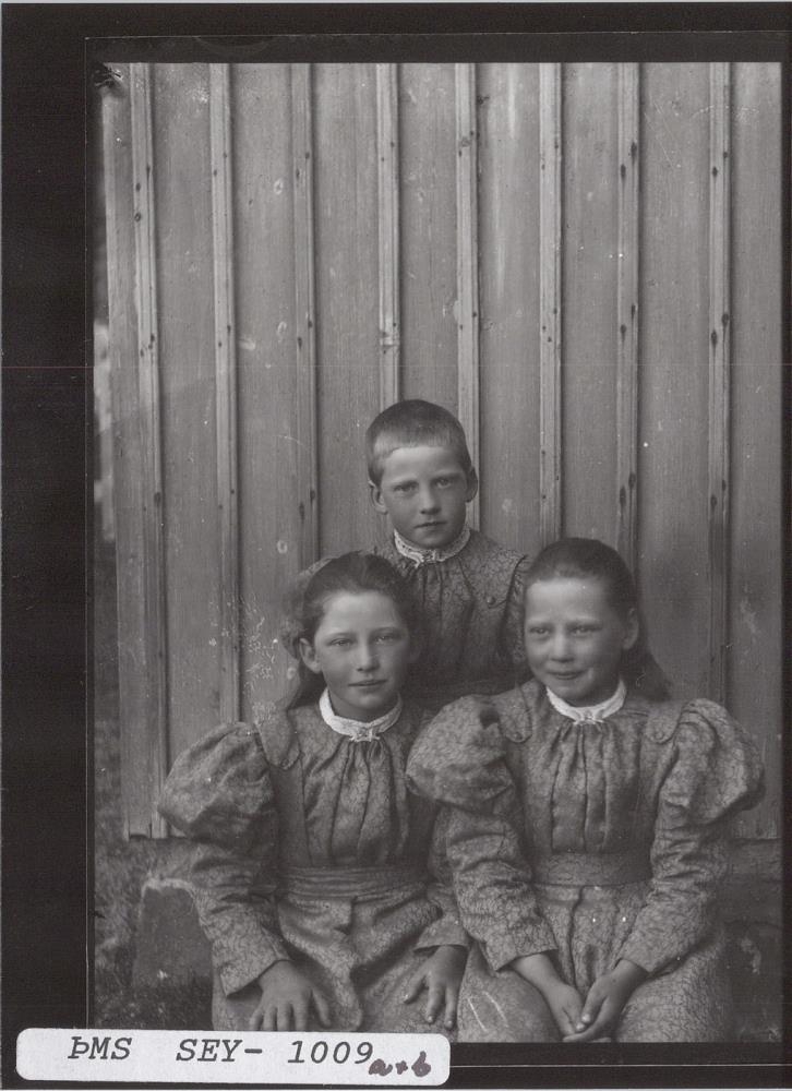 Hópmynd. Þrjár stúlkur sitja fyrir framan húsvegg, líklega systur. Þær eru klæddar í eins kjóla með púffermum. Tvær eru með sítt hár en hin er stuttklippt.