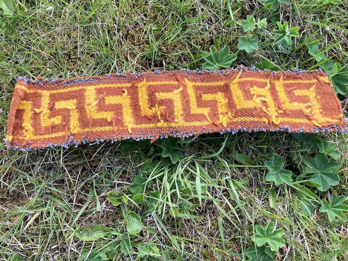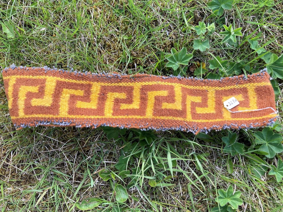 Lítill, krossofinn barði með "Alexandersbekk", ofinn af gefanda á námskeiði hjá frú Sigrúnu Blöndal höldnu á Ysta-Skála um 1920.