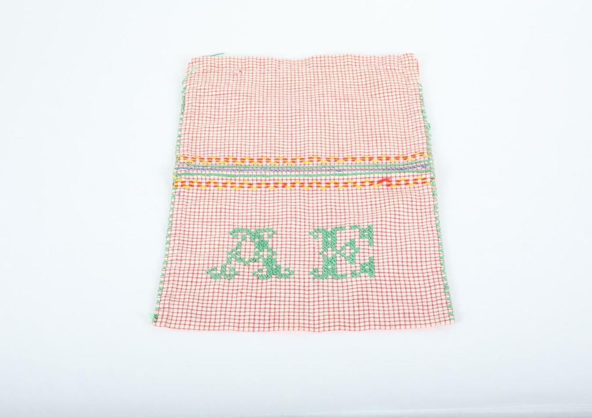 Heimagerður handavinnupoki, saumað í með krosssaumi skammstöfun gefanda "Á E". Gert af henni sjálfri þegar hún var ca. 9-10 ára.