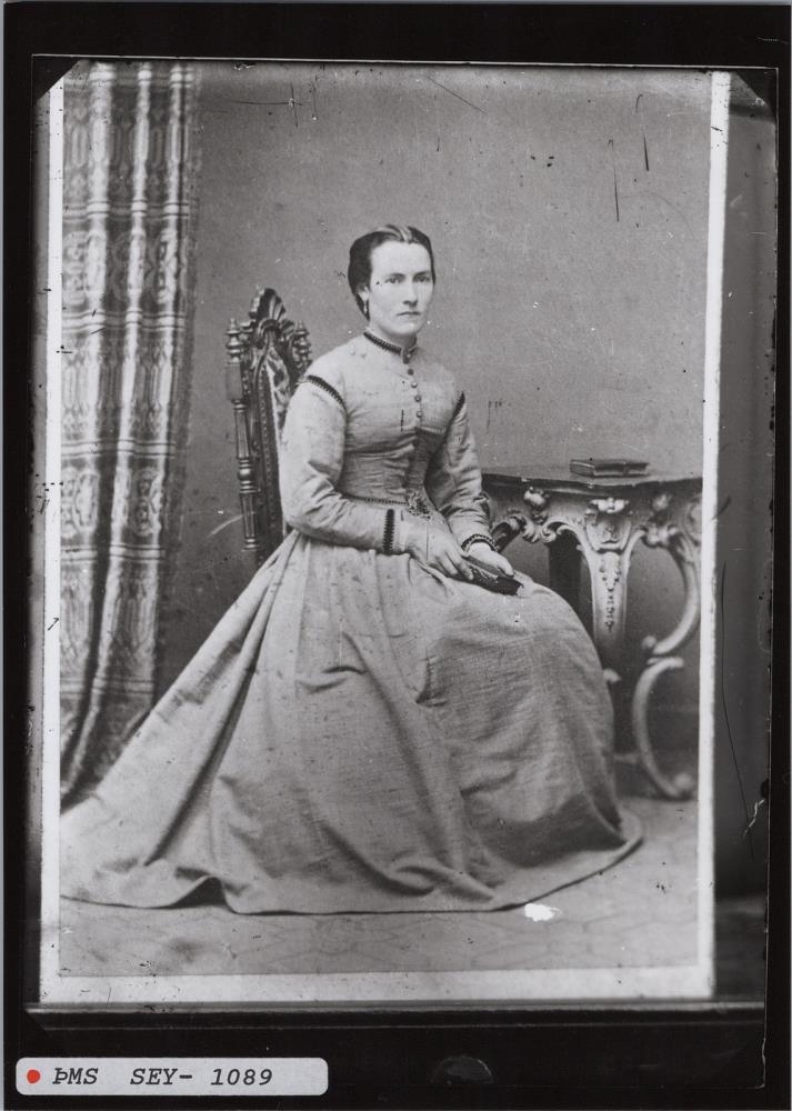 Ung kona í síðum kjól situr á útskornum stól við útskorið borð á ljósmyndastofu. VIð hlið hennar eru mynstruð gluggatjöld. Konan heldur á bók.