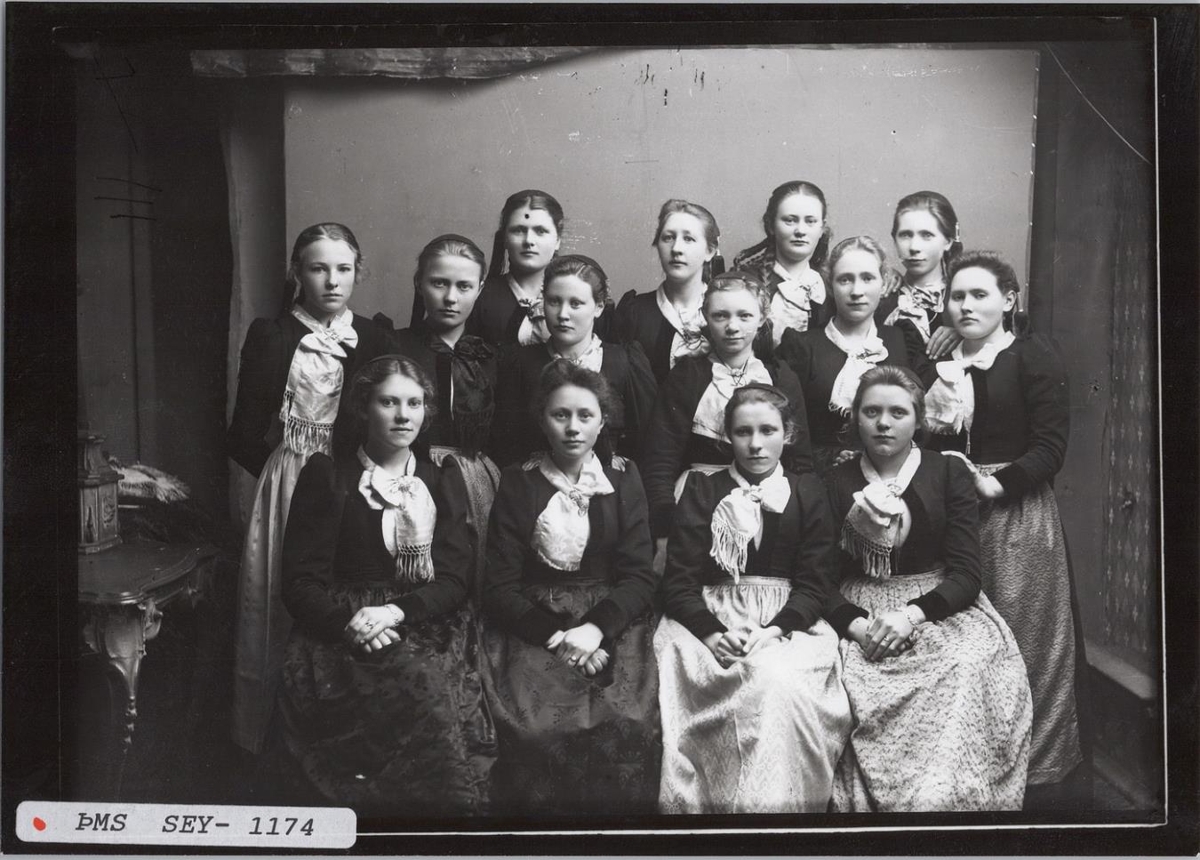 Hópmynd. 14 ungar konur í peysufötum.