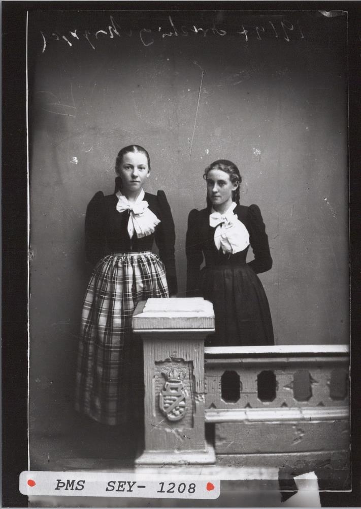 Tvær ungar konur í peysufötum standa fyrir aftan stöpul og handrið. Til hægri stendur Margrét Jónsdóttir frá Vigfúsarkoti, síðar húsfreyja á Stokkseyri.