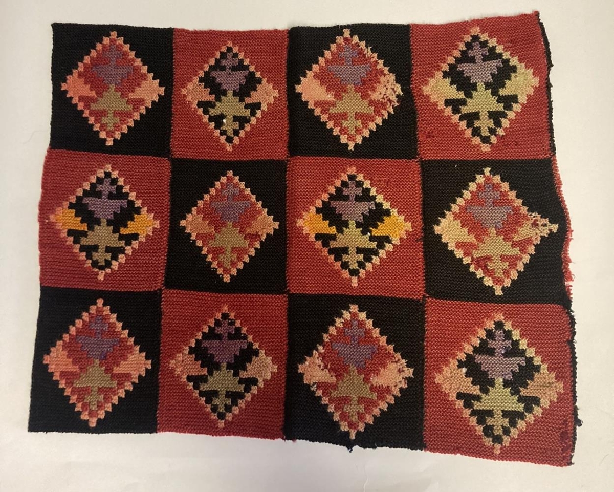 Bútur af dívanteppi prjónað árið 1916 af Solveigu Guðmundsdóttur á Móeiðarhvoli. Eiginmaður hennar var Þorsteinn Thorarensen. Gefandi frú Ástríðu Thorarensen.