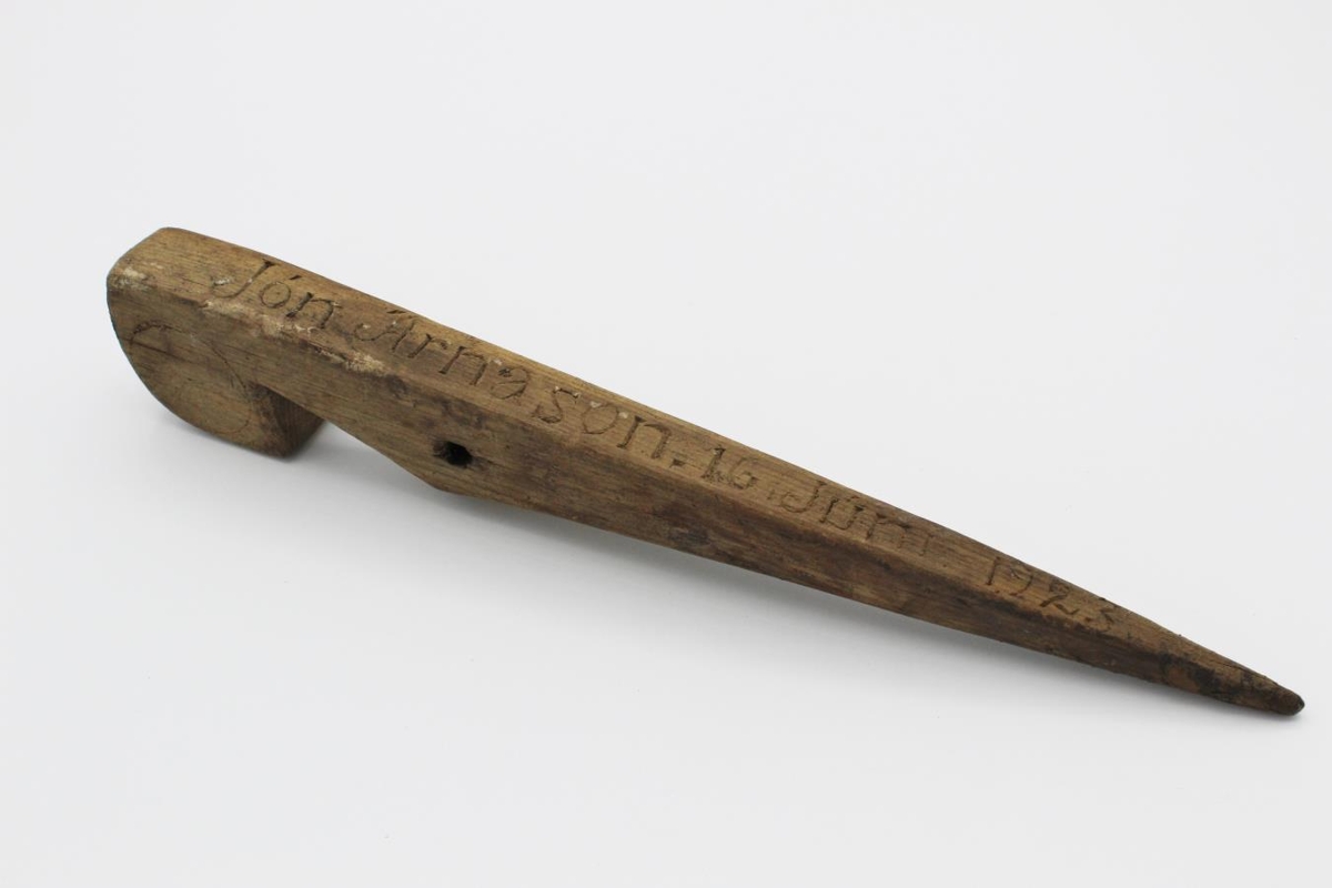 Tjaldhæll 21,5 sm á lengd, skorið á annarsvegar: „Jón Árnason 16. júní 1923“ Hinsvegar:„Tungufell“ Tjaldhællinn er smíðaður af Marel, þar sem hann lá á tófugreni um nótt nefndan mánaðardag og ár.