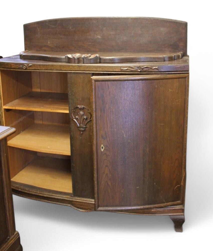 Brúnn lítill stofuskenkur, anréttuborð, dekkt eik. Tvær hurðir að neðan. Að ofan er laus brík með útskornum rósum.
