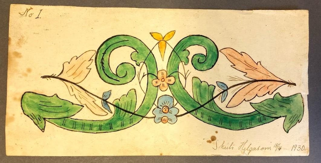 Skólateikning Skúla Helgasonar fræðimanns frá Svínavatni frá fullnaðarprófi 15. apríl 1930, Skúli þá 14 ára. Teiknað fríhendis í litum eftir fyrirmynd. Stærð 26,5 x 13 cm. Gefandi Þórður Tómasson. Skúli gaf Þórði teikninguna.