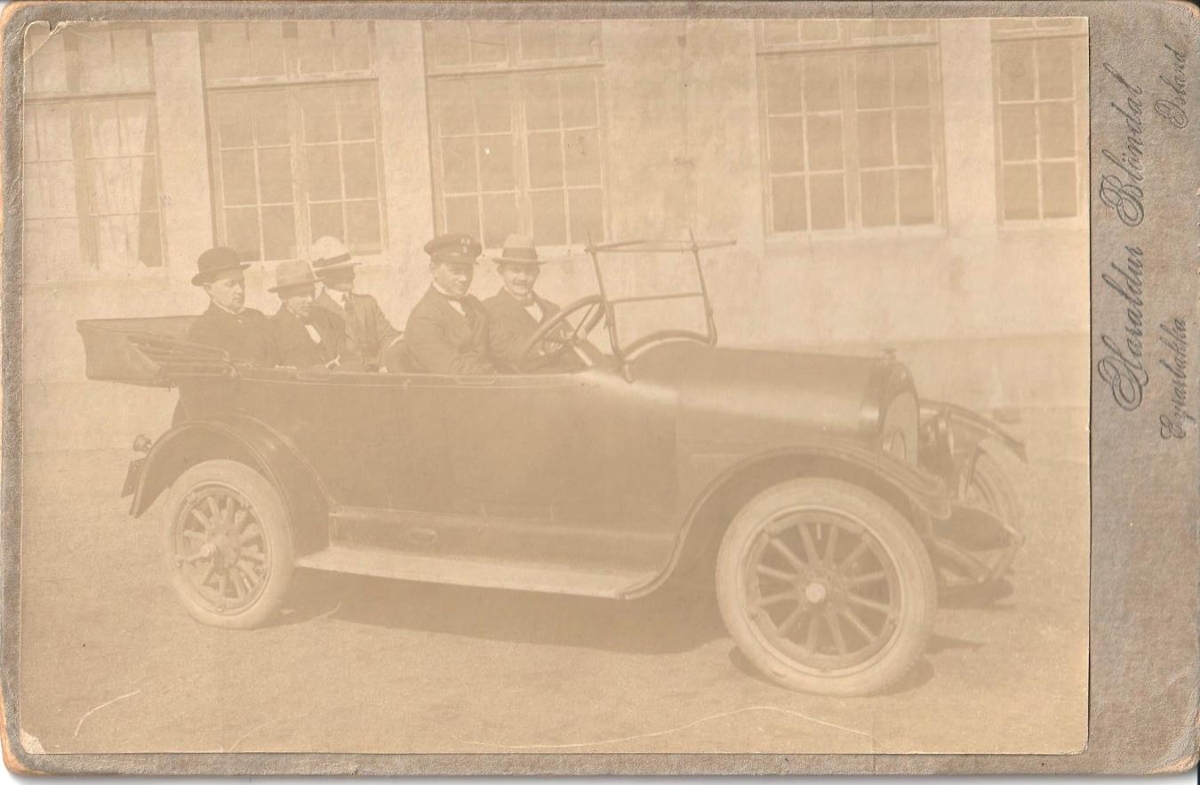 Fimm karlmenn í Overland bifreið Sigurðar Óla Ólafssonar bifreiðastjóra á Eyrarbakka, síðar alþingismanns. Myndin er tekin við barnaskólann á Eyrarbakka árið 1920. Það tók þrjá tíma að keyra bílinn frá Eyrarbakka til Reykjavíkur á þessum tíma. Þetta var fyrsti fólksbíllinn á Eyrarbakka.