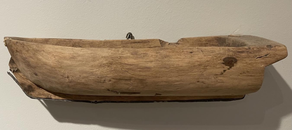 Leikfang, lítill trébátur barns, holaður úr einum spýtukubbi, kjölur blýlagður. Er víst verk núverandi bónda, Guðjóns Ólafssonar frá um 1930. Frá Blómsturvöllum í Fljótshverfi.