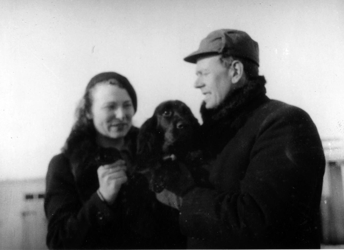 Á vetrardegi í sundlaugunum gömlu í Laugardal. Spariklædd kona og karlmaður með hund.