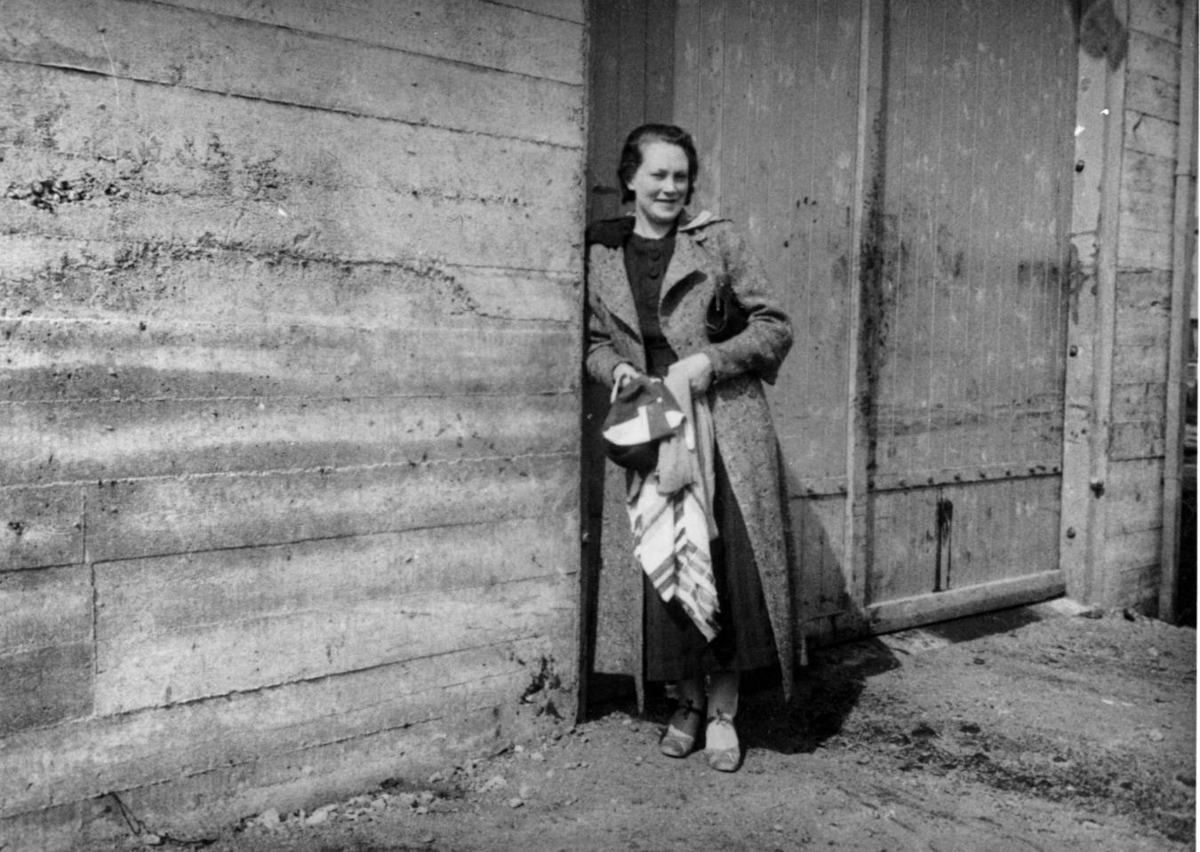 Kona við innkeyrsluhurð á steinsteyptu húsi. Sigurlaug Helgadóttir? Staður óþekktur.