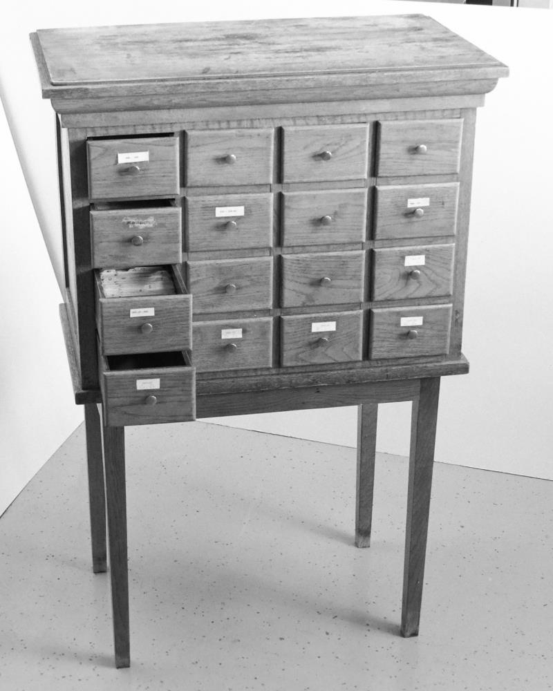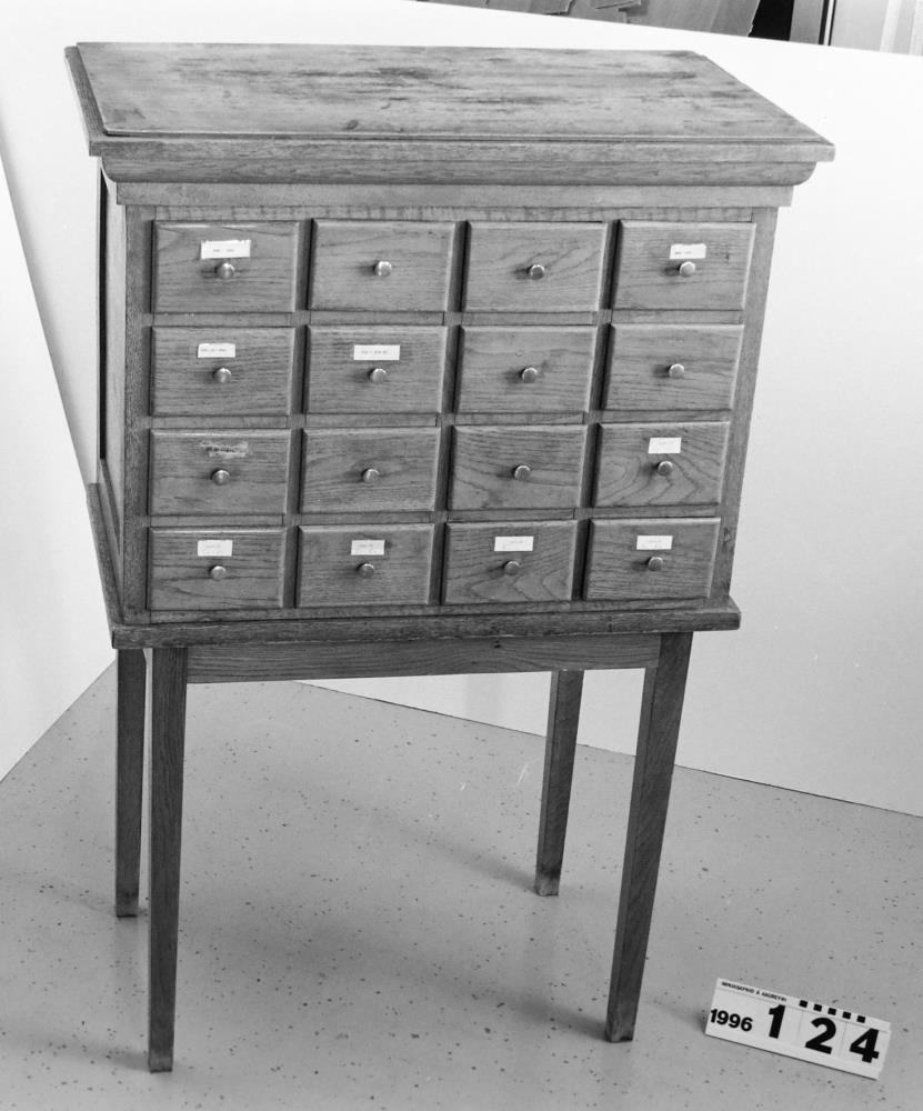 með litlum miðum með flokkurnarnúmerum bókasafnsins. Skápurinn stendur
