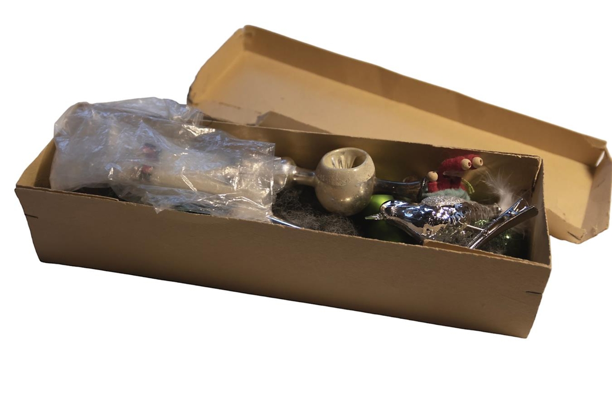Kassi með tveimur jólatréstoppum, átta grænum jólakúlum, jólafugl og jólaálfur