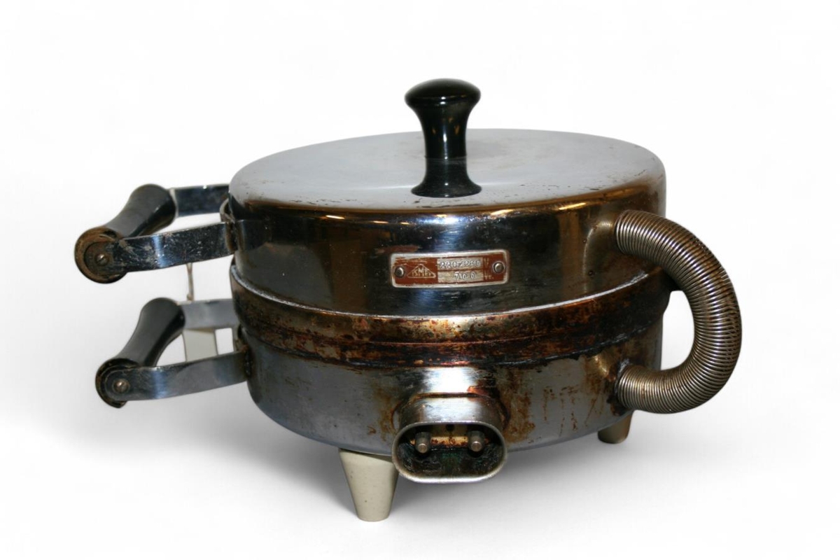 Rafmagnsvöfflujárn með handfangi úr viði. Vöfflujárnið stendur á þremur keramikfótum.