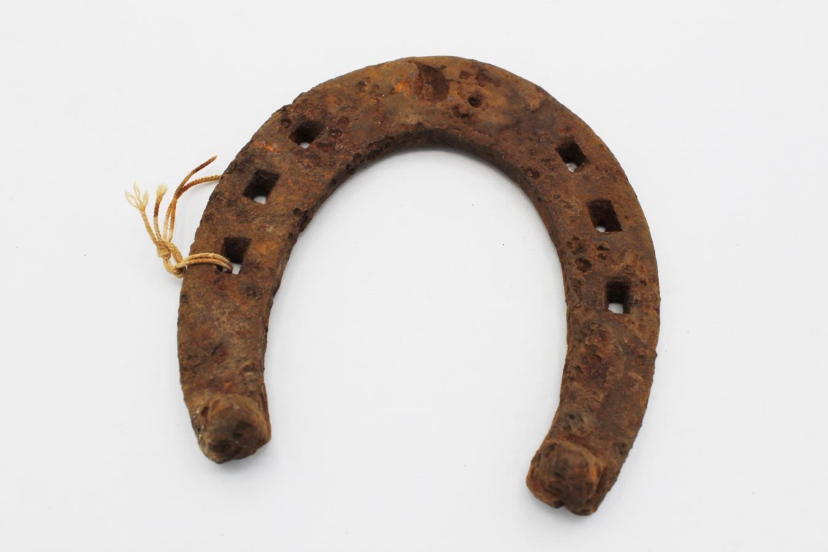 Skeifa, með stálsoðnum hælsköflum og pottaðri tá. Lá í jörð e.t.v. um þrjátíu ár, 4-5 sm grasrót hafði lagst ofan á skeifuna þar sem hún hafði týnst.