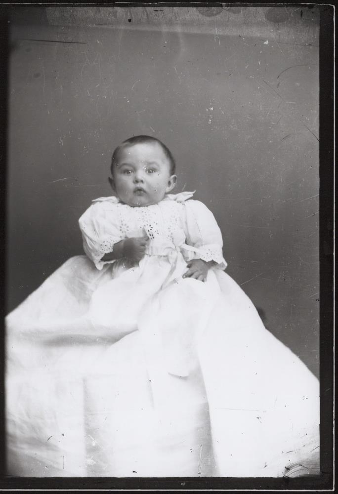 Ungabarn í hvítum skírnarkjól með blúndu. Foreldrar barnsins voru Guðrún Brynjólfsdóttir frá Engey og Þorsteinn Þorsteinsson skipstjóri. Óvíst hvaða barn þeirra þetta er.