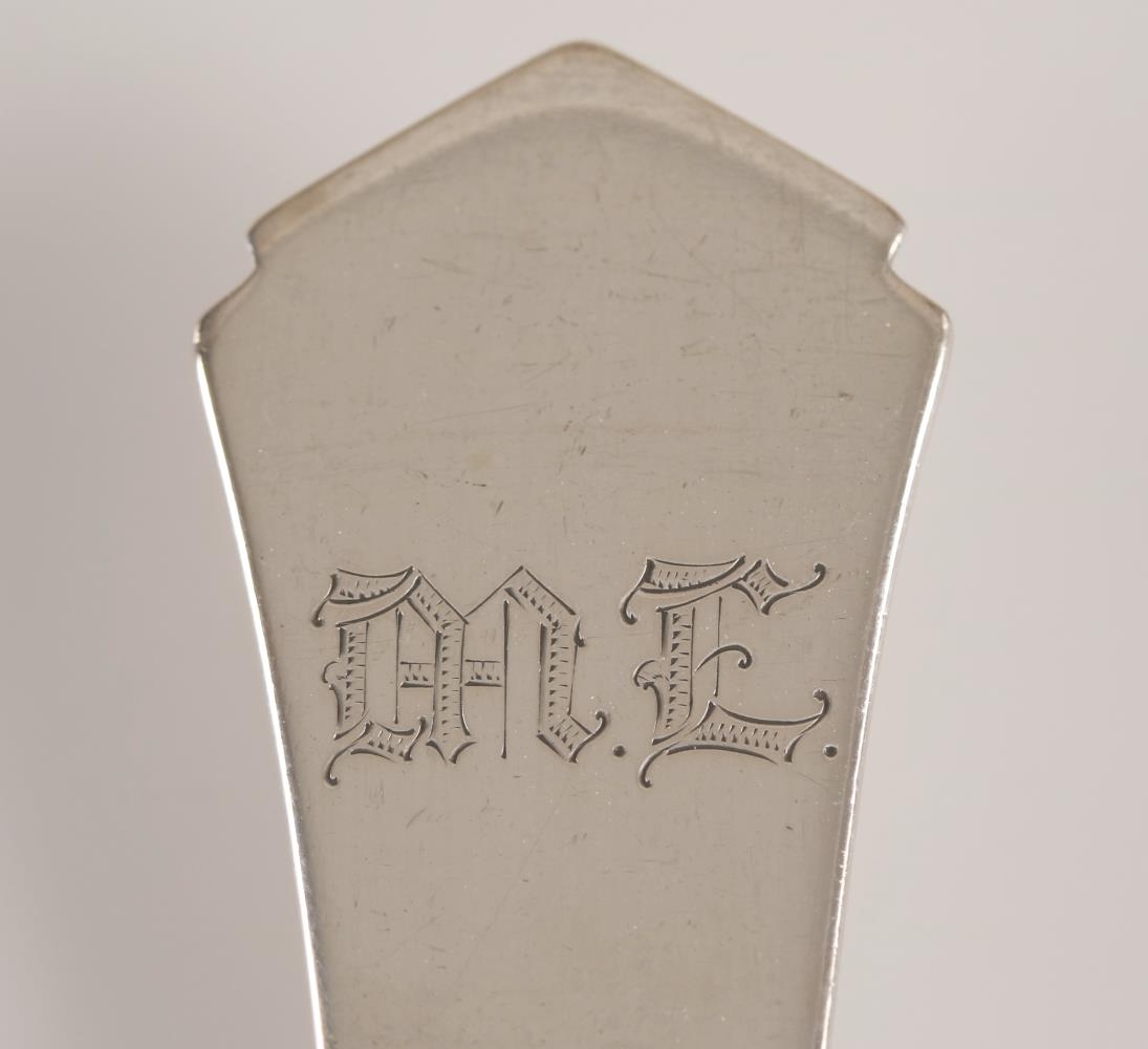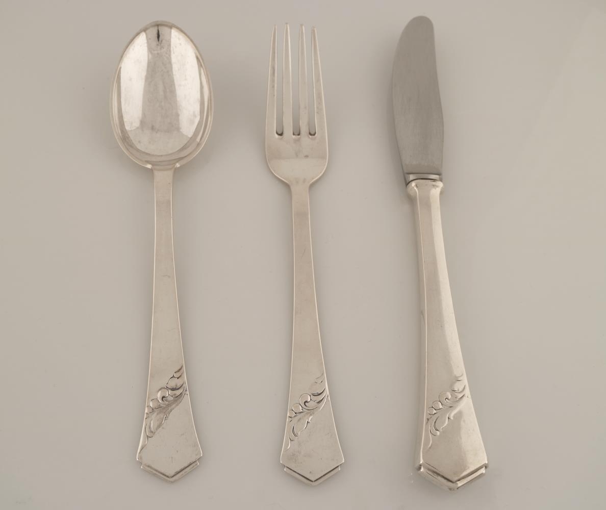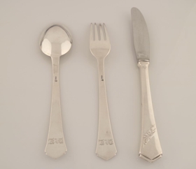 Hnífaparasett úr silfri, gaffall, hnífur og skeið. Sama mynstur er við enda skafts allra gripanna, skáhalt jurtamynstur beggja megin skaftsins. Þá hefur endi skaftsins odd. Gaffallinn og skeiðin virðast hafa verið framleidd á sama tíma. Fangamarkið "M.E." er greypt í bakhlið beggja gripa, við enda skaftsins. Neðar á skaftinu er smiðsstimpillinn "ss" með punktamynstri hringinn í kring um stafina. Til hliðar er hreinleikastimpillinn "830S". Gaffallinn er 20 cm að lengd og 2,7 cm að breidd. Skeiðin er 20 cm að lengd og 4,5 cm að breidd. Hnífurinn sker sig úr þrátt fyrir sama mynstur, en á annarri hlið skaftsins er smiðsstimpillinn "ss" án hringsins í kring. Hreinleikastimpillinn er "925S". Eru gaffallinn og skeiðin því úr 83% silfri en hnífurinn úr 92,5% sterling silfri. Skaft hnífsins er auk þess töluvert hærra en flöt sköft hinna gripanna, en hæð hans er 1,1 cm á meðan sköft hinna gripanna eru 1 mm. Hnífurinn er 23 cm að lengd og 2,5 cm að breidd.