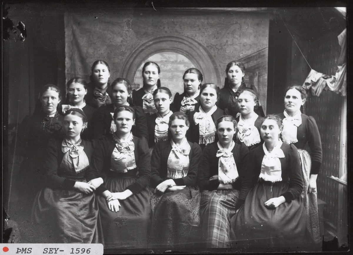 Hópmynd. 16 konur í peysufötum. Þriðja frá vinstri í fremstu röð er Anna Sigríður Hafliðadóttir en hún kenndi fatasaum. Mögulega eru þetta konur að læra hjá henni.