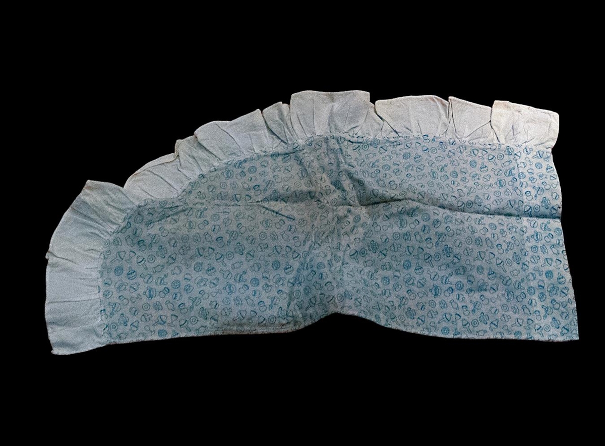 Ein stök gardína sem er hvít í grunninn með bláu munstri og hvítri pífu en hinn vænginn vantar.
