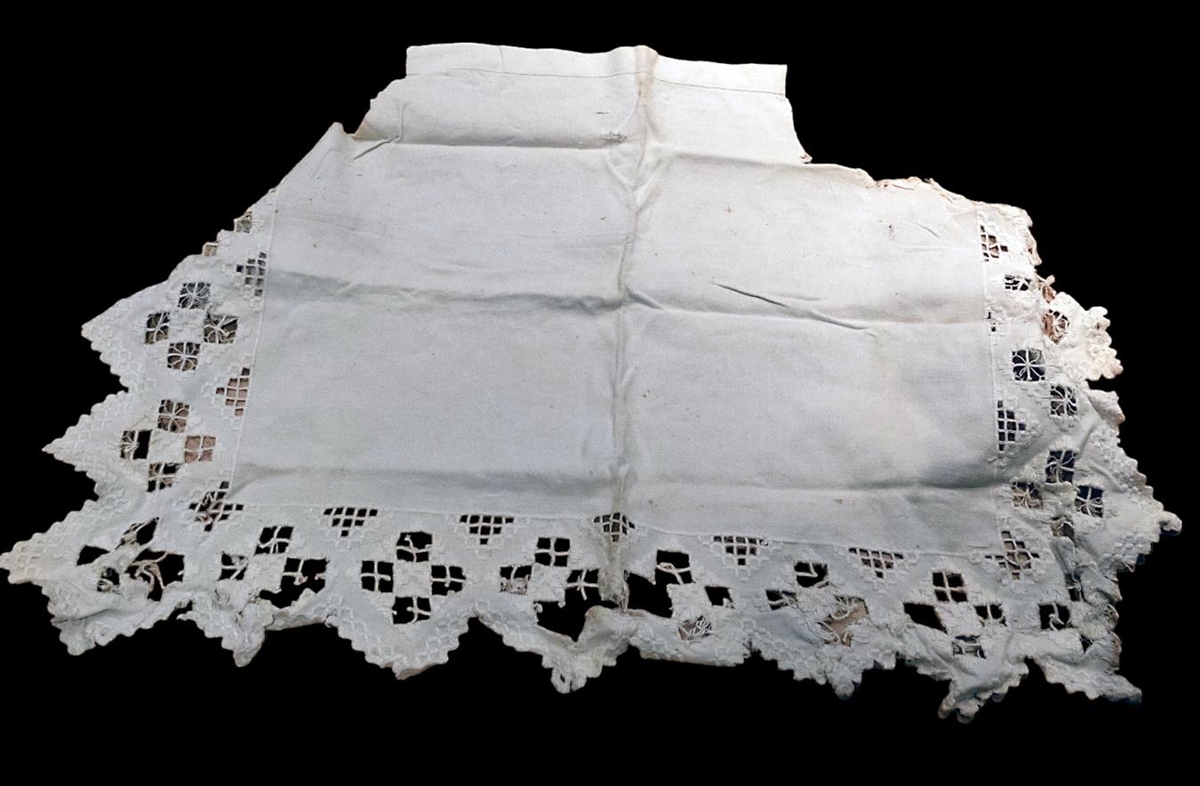 Hvítur kommóðudúkur með harðangurs- og klaustursaum, mjög slitin. Kristín hefur klippt upp í og líklega ætlað að nota sem svuntu.