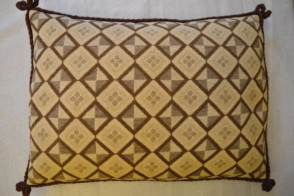 Krosssaumspúði, tíglamunstur í gráum litum, 50 x 35 cm. Útsaumur Guðrúnar um 1935. Snúra er saumuð utan með (brún). Vandað og gott verk.
