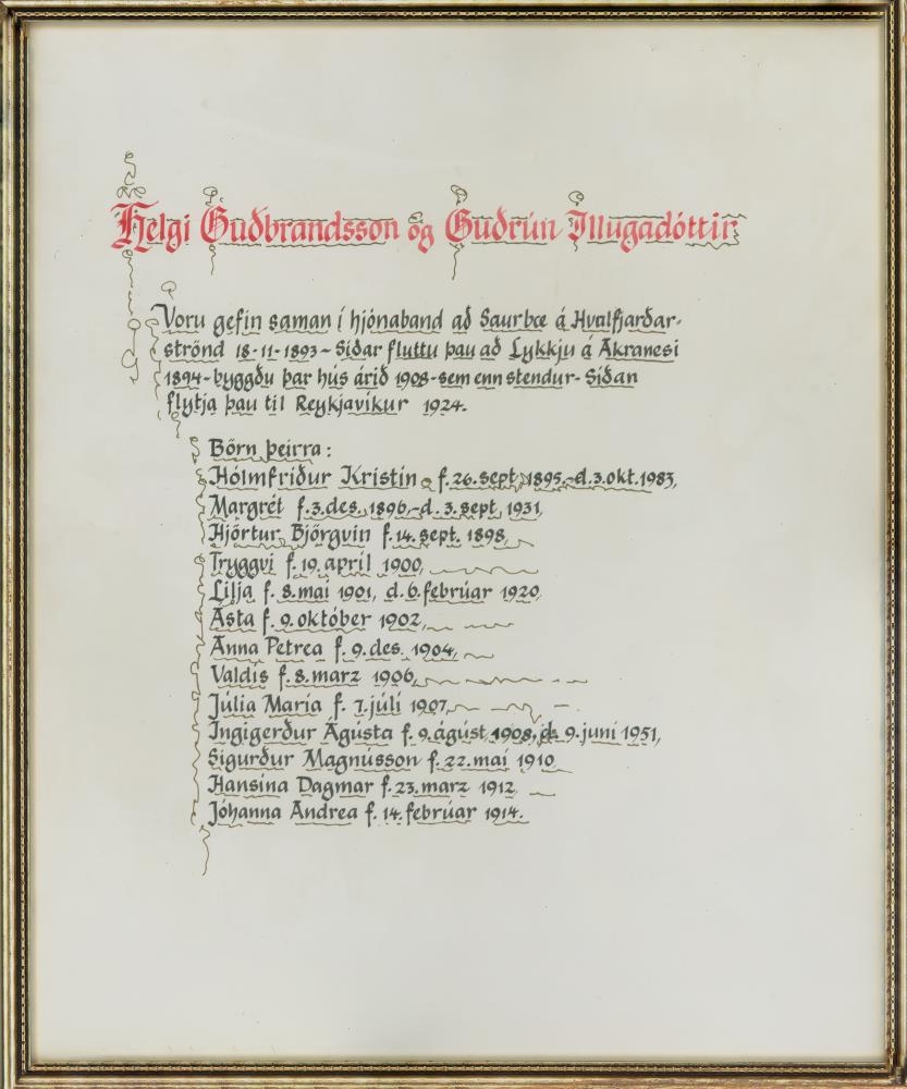 Skjalið er skrautskrifað af syni þeirra Tryggva þegar hann var ca 85 ára