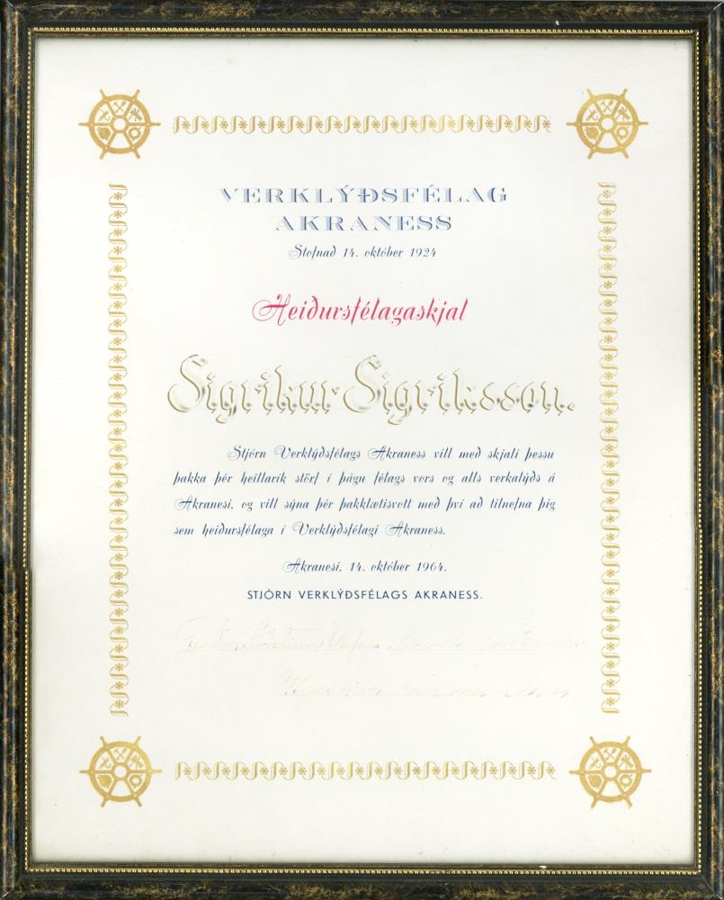 Heiðursfélagaskjal Sigríks Sigríkssonar frá Krossi í Innri-Akraneshreppi ,f.18/9 1900, dí apríl 1980. Honum veitt af stjórn Verklýðsfélags Akraness 14 okt 1964. Börn hans gáfu safninu 5 maí 1980.