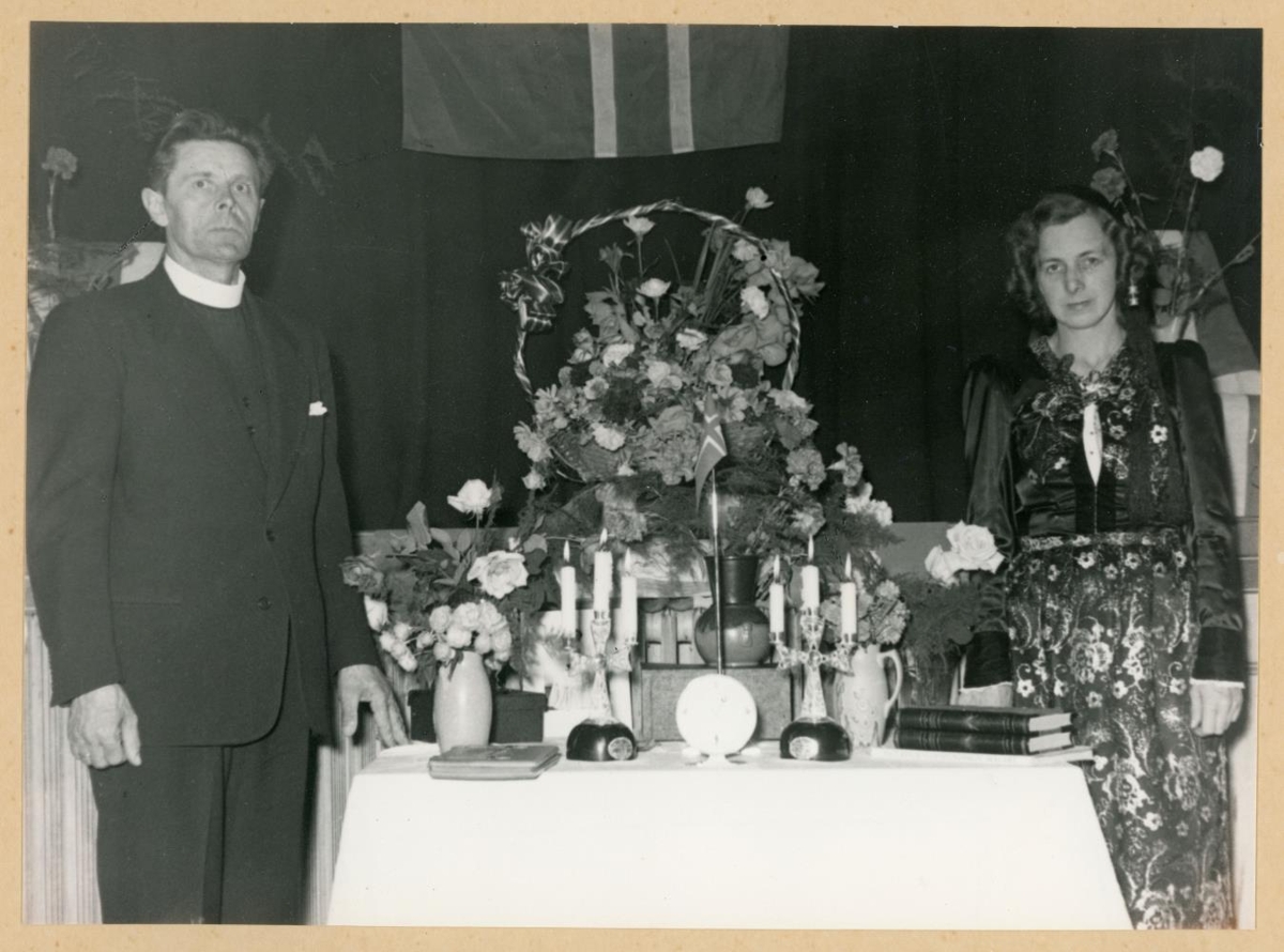 Séra Eiríkur Brynjólfsson prestur á Útskálum í Garði og kona hans, Guðrún Guðmundsdóttir. Samsæti þeim til heiðurs í samkomuhúsinu í Garði árið 1952.