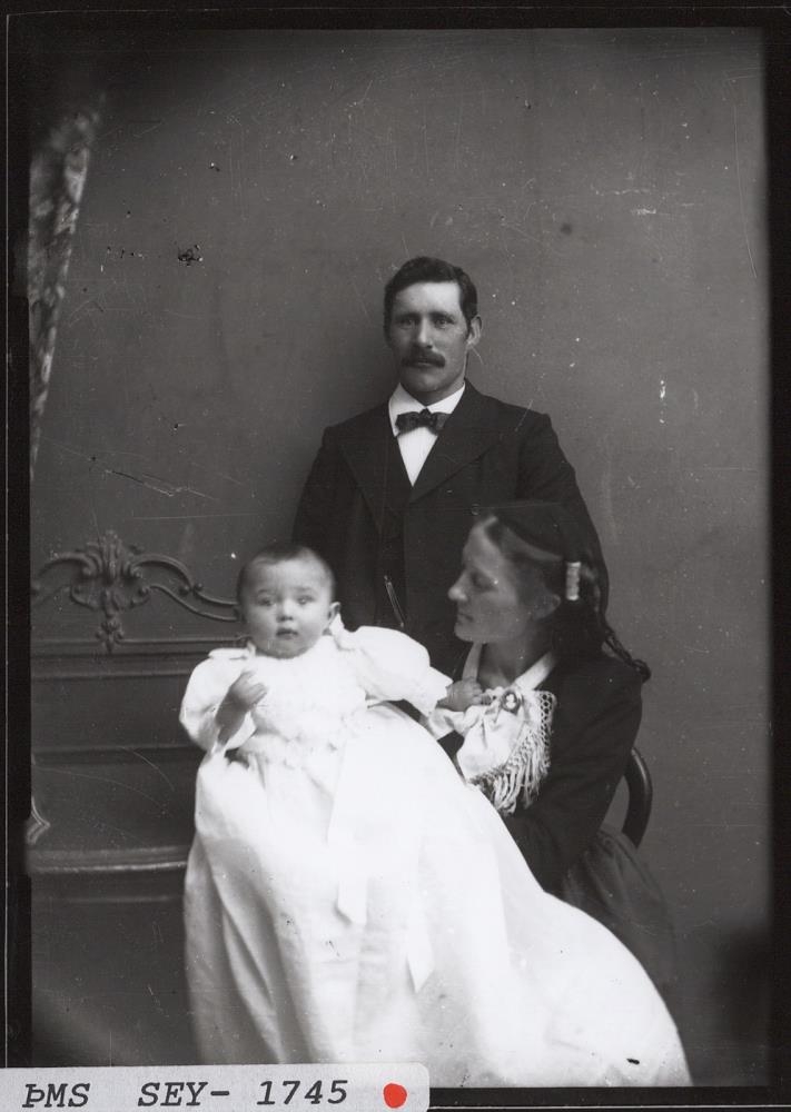 Hjónin Guðrún Brynjólfsdóttir frá Engey og Þorsteinn Þorsteinsson skipstjóri ásamt ungabarni sínu. Guðrún heldur á barninu sem er í hvítum skírnarkjól.