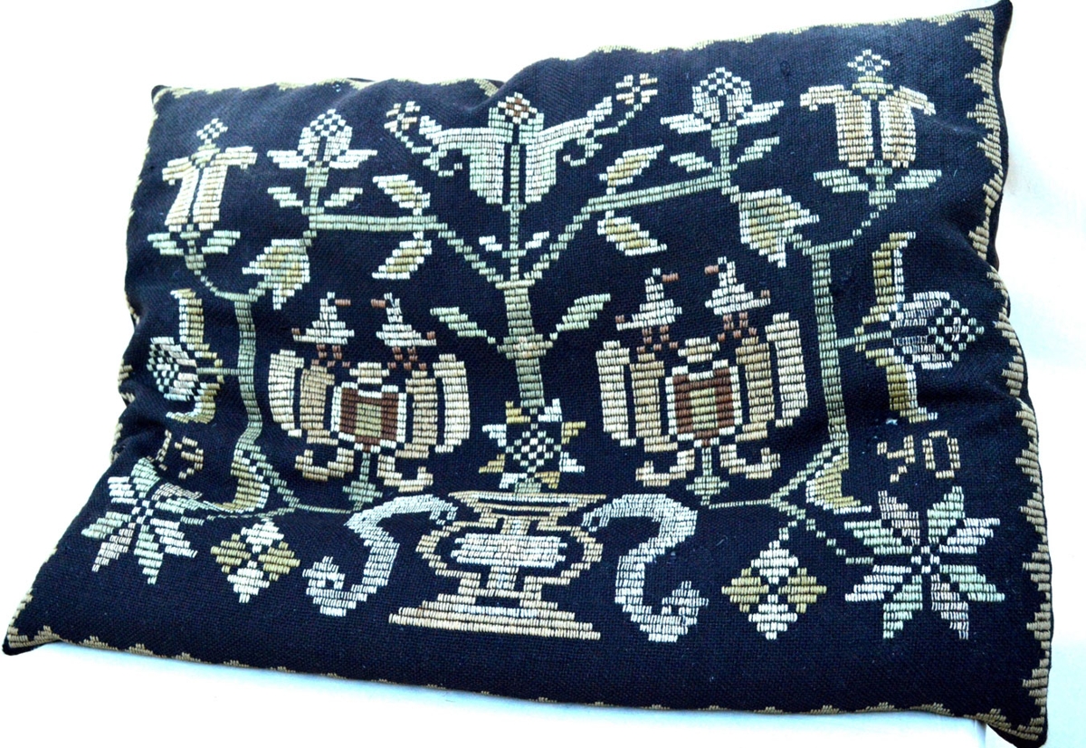 Stór, glitsaumaður (glitofinn) stofupúði. Saumað er í svarta ullareinskeftu. Stærð 60 x 45 cm. Ártal 1940. Skreyti er jurtapottur og áttblaðarós.