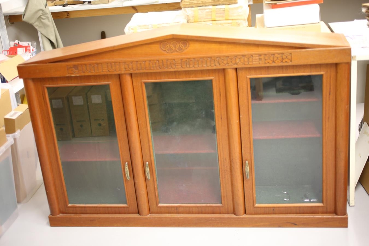 Skápur úr tré. Fyrir honum eru þrjár hurðar úr gleri. Gerður til að standa upp á borði eða bekk. Fyrir ofan hurðarnar er útskurður, annars vegar ólympíuhringirnir og hins vegar texti með höfðaletri þar sem stendur: "5. júní - Vilhjálmur Einarsson - 1969".