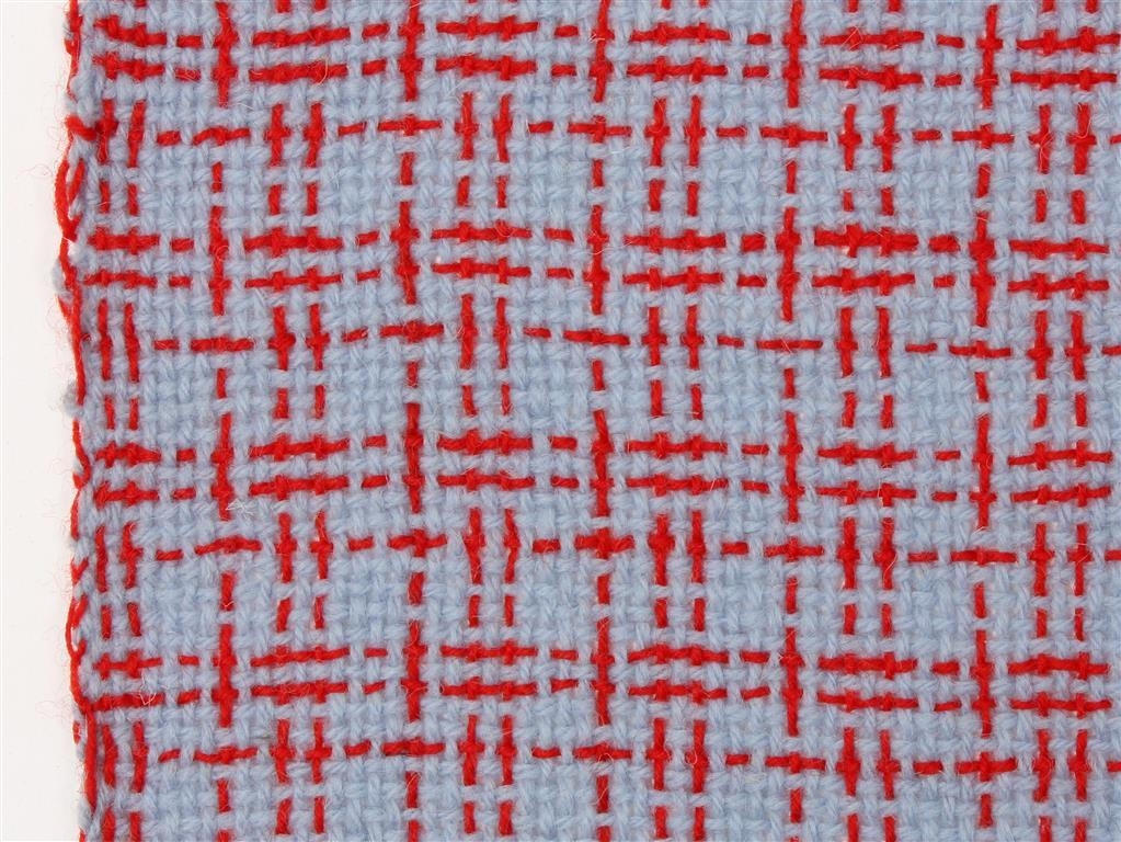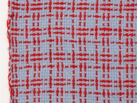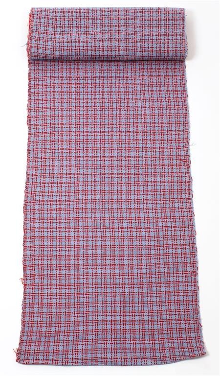 Stragni af blá- og rauðyrjóttu ullarefni. Litamunstrað. Frá Vefnaðarstofu Karólínu Guðmundsdóttur.