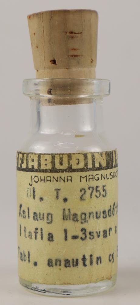 Sívalt lyfjaglas, lítið úr glæru gleri með korktappa, merkt "Lyfjabúðin Iðunn". Í glasinu hafa verið "Tabl. anautin ..." Á miðanum stendur: Jóhanna Magnúsdóttir, I.T. 2755. Áslaug Magnúsdóttir, 1 tafla 1-3svar á dag. Tabl. anautin og 5 No:xx.