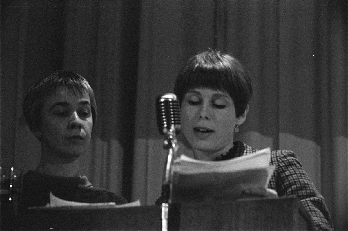 Sara í ræðupúlti og önnur kona með (kannski túlkur).