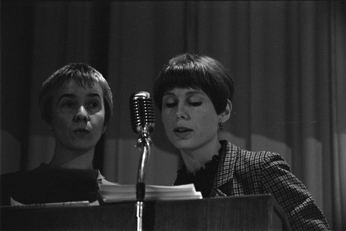 Sara í ræðupúlti og önnur kona með (kannski túlkur).